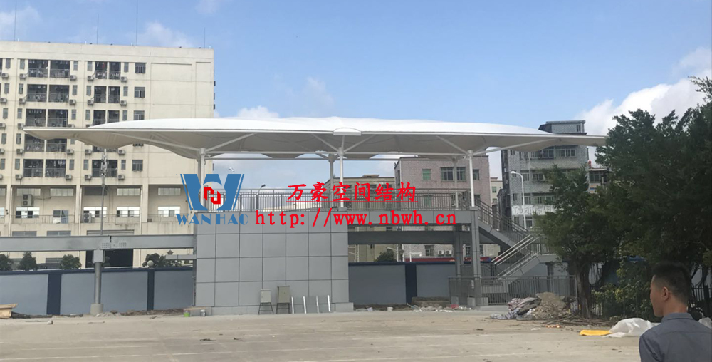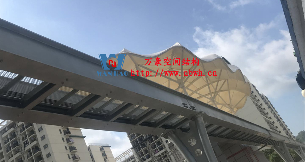 云巴園區(qū)試驗示范線膜結(jié)構(gòu)工程-四角站(原名:坪山一期生產(chǎn)園區(qū)C型線云軌站)位于深圳市坪山區(qū)比亞迪路3009號比亞迪股份有限公司園區(qū)四角大廈西面,該工程用鋼量50噸,膜材展開面積2000平方米,遮蓋材質(zhì)選用最為優(yōu)質(zhì)的ETFE膜材(日本旭硝子),鋼構(gòu)則選用了起拱和各種大小圓弧相融合。