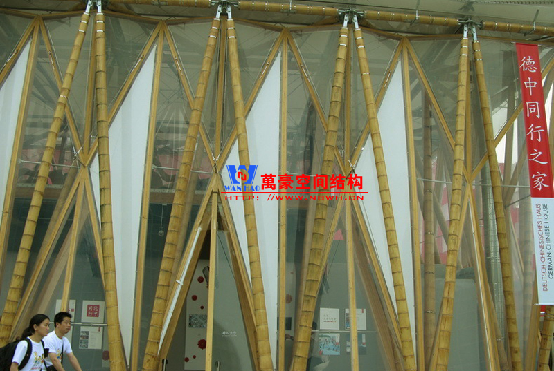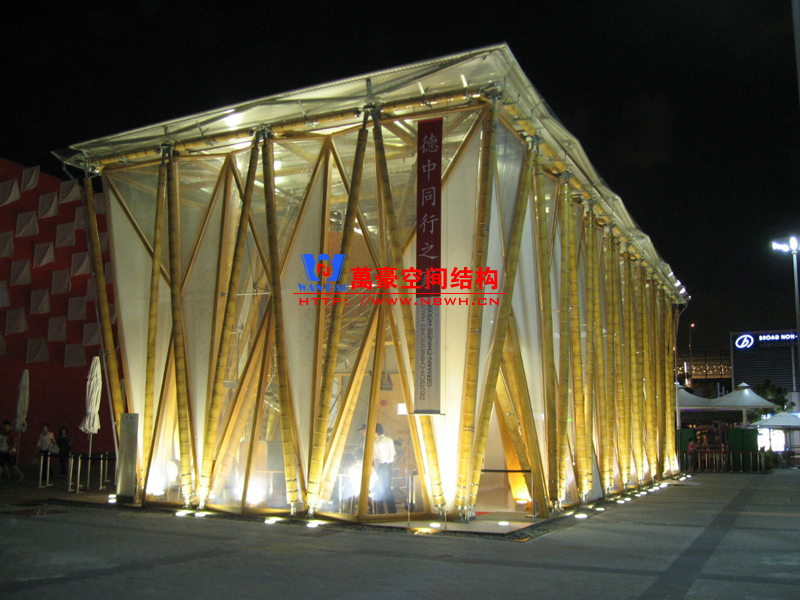 德中館展館膜結(jié)構(gòu)內(nèi)部樓板由膠合竹板制成的巨型梁柱體系架構(gòu),其連接構(gòu)件及表面處理技藝均為此建筑量身打造。高達(dá)六米的梁柱將建筑內(nèi)部進(jìn)行二次分割,營(yíng)造出獨(dú)立的二層樓面空間。竹桿支撐體系在建筑屋面層通過(guò)鋼節(jié)點(diǎn)相互連接固定。屋面面層采用PVC 膜覆蓋,墻體結(jié)構(gòu)則由天然竹材和透明輕盈的新型材料ETFE膜復(fù)合構(gòu)成。整個(gè)膜結(jié)構(gòu)建筑體現(xiàn)了可持續(xù)和環(huán)保的理念,易建易拆,所有材料皆可回收或重復(fù)使用;材料來(lái)源本地化,除特殊結(jié)構(gòu)件外多數(shù)產(chǎn)自中國(guó)本土。