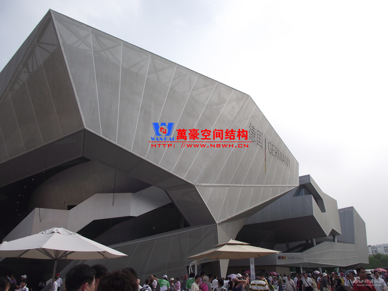 世博會(huì)德國(guó)館膜結(jié)構(gòu)建筑建成于2009年7月,于2010年在中國(guó)上海世博會(huì)上正式投入使用,是中國(guó)國(guó)內(nèi)經(jīng)典膜結(jié)構(gòu)建筑之一。德國(guó)館位于盧浦大橋附近的黃浦江南岸,與瑞士、法國(guó)和波蘭館相鄰,占地面積6000平方米。由于膜結(jié)構(gòu)材料的特殊屬性,可以讓德國(guó)館的形態(tài)呈不規(guī)則狀,十分的別致。展館四面呈開(kāi)放狀,其建筑設(shè)計(jì)給人一種輕盈、飄逸的感覺(jué),又像是在邀人同游。德國(guó)館的建筑體外部由一層透明的銀色發(fā)光建筑膜結(jié)構(gòu)包裝起來(lái),展館的四大建筑主體懸架于和諧都市展廳入口所在的底層區(qū)域。
