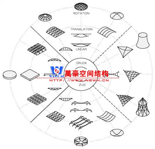 網(wǎng)殼結(jié)構(gòu)的定義有三個關鍵詞:“曲面”、“桿件”、“薄膜作用”。我們從而可以找到網(wǎng)殼結(jié)構(gòu)在結(jié)構(gòu)體系中的位置。