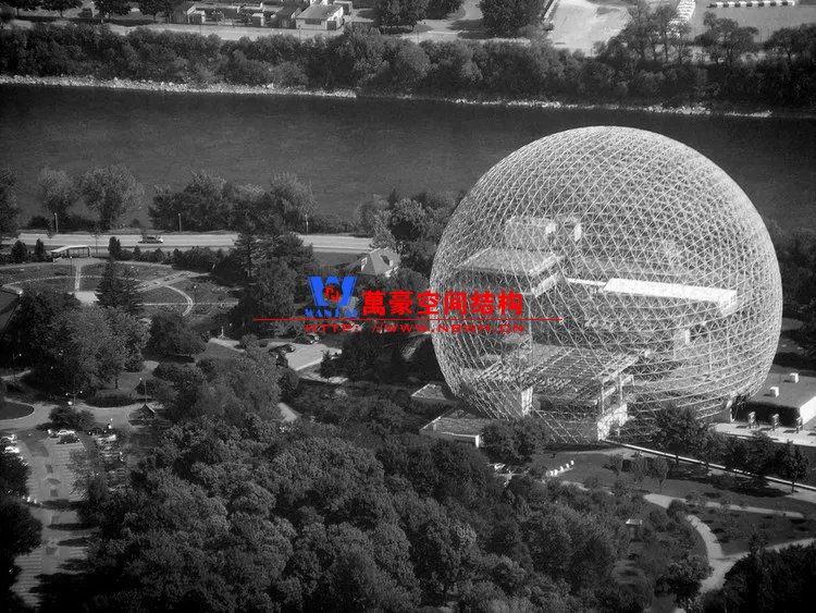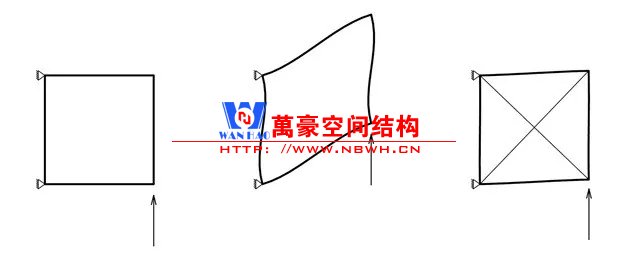 提高平面內(nèi)剛度的直接方式是采用三角形網(wǎng)格。富勒發(fā)明了短線呈穹頂,并應用于1967年蒙特利爾國際博覽會上的美國館——一座直徑為76m的3/4球形建筑。