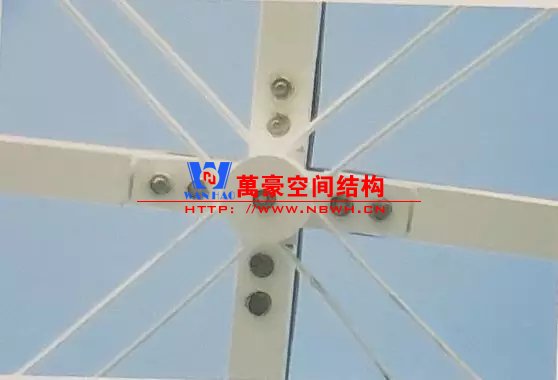 羅馬尼亞布加勒斯特穹頂1961年建成,跨度約93.6米,矢跨比約1:5。鋼管桿件構(gòu)成的單層網(wǎng)殼,網(wǎng)格呈等邊三角形式,支承在沿圓形周邊布置的混凝土柱上。在網(wǎng)格的節(jié)點處有三個方向鋼管匯交,如何連接?