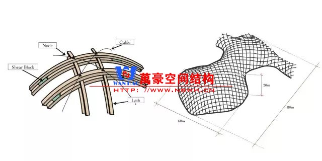最終形態(tài)與初始形態(tài)相比,原來的正方形網(wǎng)格轉(zhuǎn)變?yōu)榱庑巍M瑫r,單根5cmx5cm木條剛度很小,允許發(fā)生足夠大的彎曲變形。在達到設計形狀后,需要修整外殼的邊緣;并且在菱形網(wǎng)格中增設交叉拉索,使柔軟的網(wǎng)格成為堅固的結(jié)構(gòu)。
