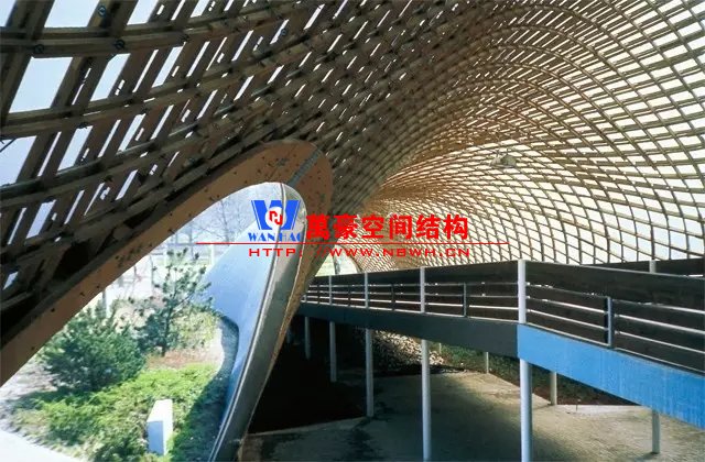 2000年,奧托和與坂茂合作了漢諾威世博會日本館,采用了與曼海姆大廳類似的網(wǎng)殼結(jié)構(gòu),只是屋面網(wǎng)格的木材換成了紙卷。