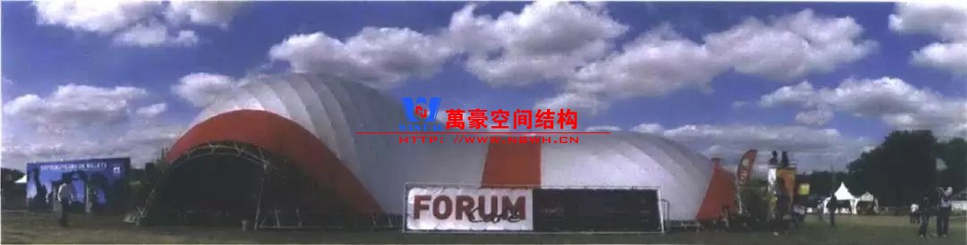查爾斯.威廉郵政學院(CharlesWilliam Post College)于1970年建造了一個劇院。屋面采用鋼結(jié)構(gòu)穹頂,穹頂直徑約52米,由環(huán)繞于四周的鋼柱支承,鋼柱間沿經(jīng)線均勻布置四十榀鋼管桁架。穹頂頂部設鋼壓力環(huán),底部采用圓形的雨棚作為拉力環(huán)。緯向每隔一格布置連續(xù)十字交叉支撐。