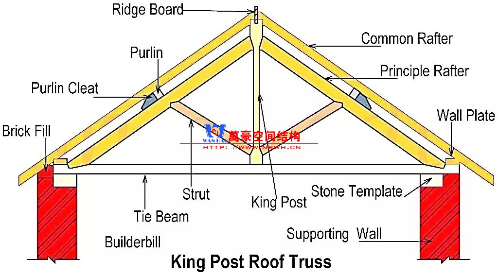 早期的三角桁架只有2根斜置上弦桿和1根水平下弦桿。而后,人們根據(jù)經(jīng)驗(yàn),嘗試在三角形內(nèi)部對應(yīng)弦桿中間點(diǎn)的位置,增加了3根腹桿,演化出單柱式屋架(KingPost Truss)和雙柱式屋架(QueenPost Truss) 兩種基本形式。