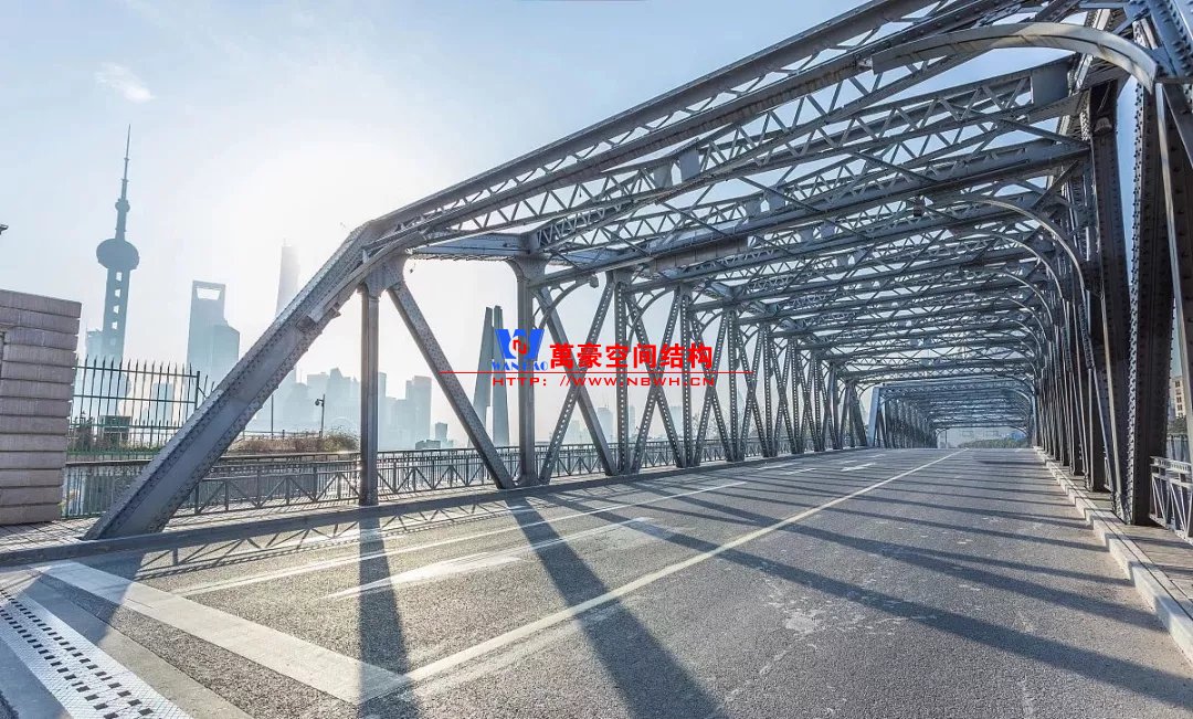 位于上海的外白渡橋是中國的第一座全鋼結(jié)構(gòu)鉚接橋梁,于1908年1月20日落成通車。該橋?yàn)橄鲁惺胶喼т撹旒?,兩孔跨?jīng)組合各52.12米,橋面鋪設(shè)電車軌道。