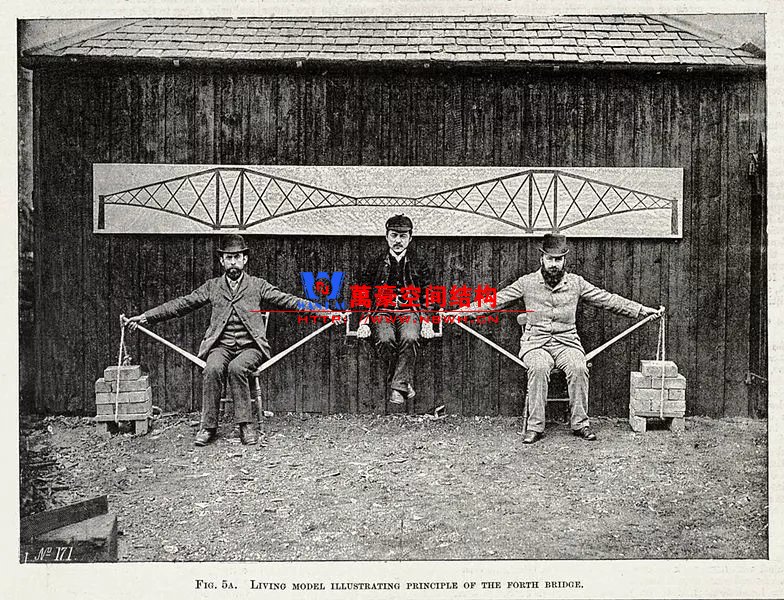 為了市民解釋懸臂桁架橋梁的原理,工程師做了一個簡易的示范試驗(yàn),以手臂作桁架拉桿、鋼棒作壓桿,兩人坐在椅子上很輕松地托起中間跨的重荷載(簡支桁架段)。圖中的三人分別是大橋的設(shè)計師JohnFowler、BenjaminBaker和工程指揮渡邊嘉一。