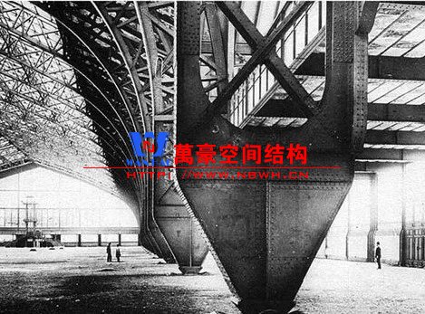 巴黎世博會機(jī)械館由工程師J·B.Krantz和埃菲爾Eifel設(shè)計,于1867年建成。它采用鋼制三鉸拱,拱截面為桁架格構(gòu)形式。共有20榀這樣的鋼拱,形成寬115米、長420米,內(nèi)部毫無阻擋的龐大室內(nèi)空間。