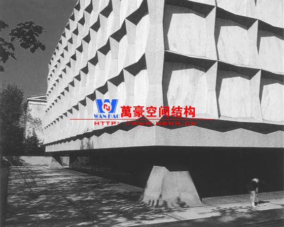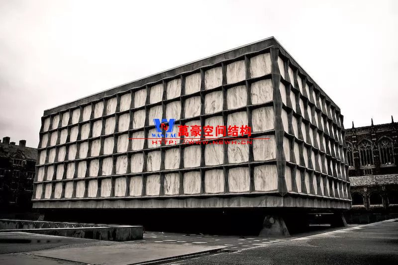耶魯大學(xué)善本圖書館采用了多層空腹桁架。建筑上部五層整體構(gòu)成空腹桁架由四角的柱墩支承,建筑首層全部架空。