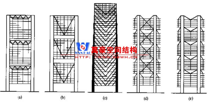 (1) 結構的主要承重構件為兩端的巨型格構柱,承受全樓的重力荷載和水平荷載。每個巨型格構柱的平面輪廓尺寸為4.8mx5.1m,由4個圓鋼柱組成,鋼柱間每隔3.9m(層高)均連以矩形截面加腋鋼梁,形成空腹格構式的豎向構件。水平面內(nèi),還增加了斜向的交叉撐。