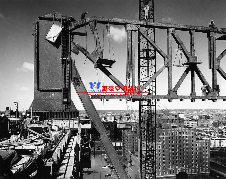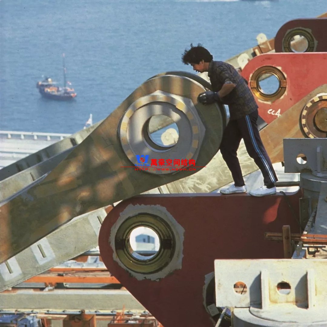 懸索上部支承著受壓鋼立柱(工字形截面),其下部以同樣的間距吊掛著受拉吊柱(扁鋼)。為方便連接,數(shù)根4英寸(100mm)直徑的懸索內(nèi)嵌在寬翼緣的構件中,立柱和吊柱均與懸索外面的構件相連。