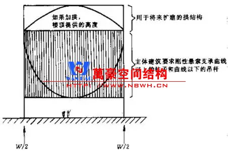 該11層建筑頂部為一長條形矩形平面,目前沒有任何結構。將來需要增層擴建時,可在它上面再架設承重拱結構。新增樓層的重力通過拱傳遞給兩側筒體,并產(chǎn)生筒體向外的推力,正好可以平衡懸索引起的向內(nèi)的壓力。