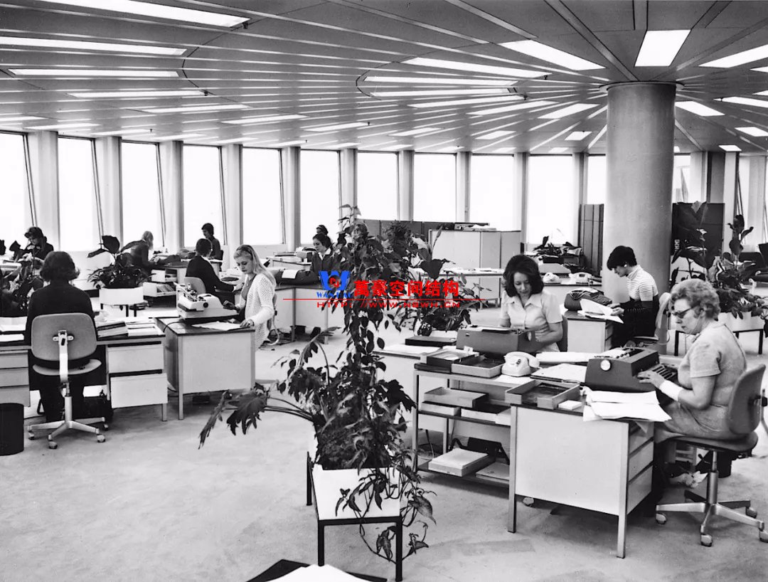 吊柱位于樓面中部靠近核心筒的位置,樓面梁呈放射狀。從下圖中可以看到,其內(nèi)部空間排布非常靈活。