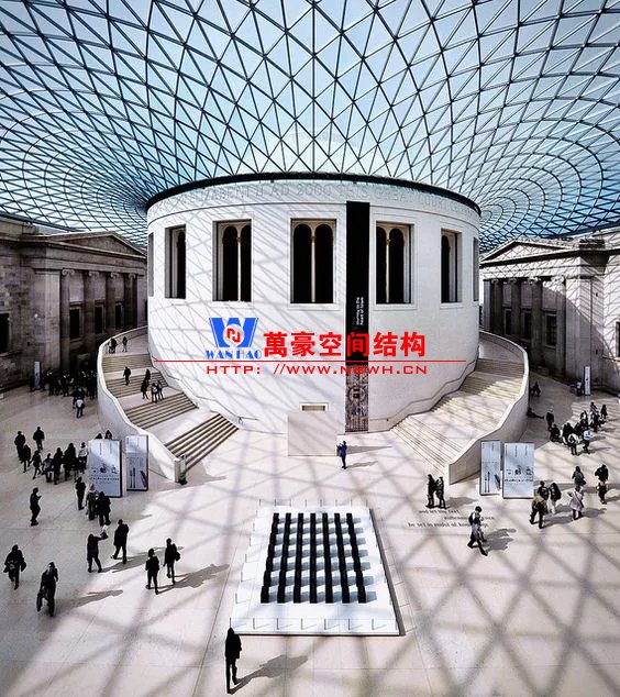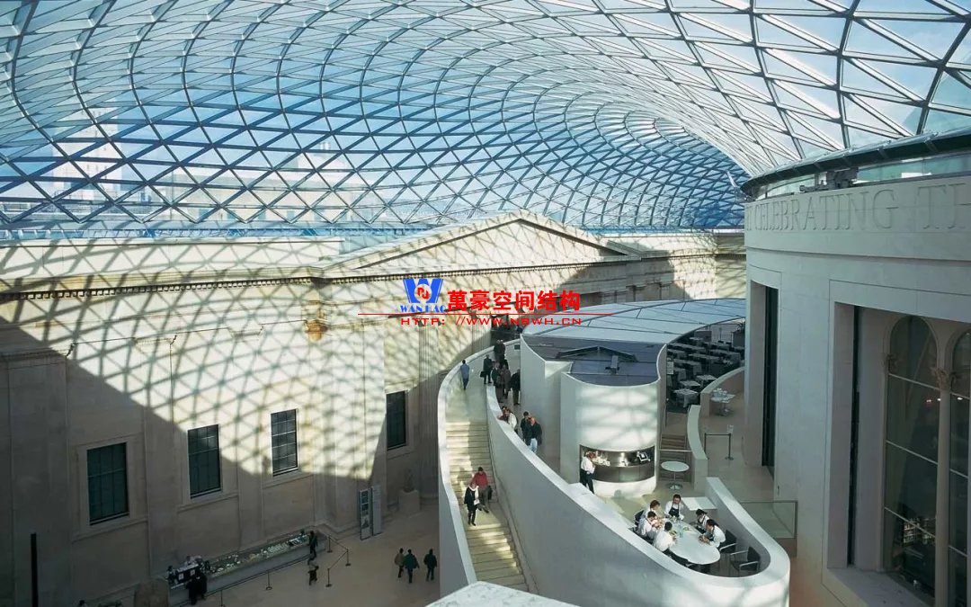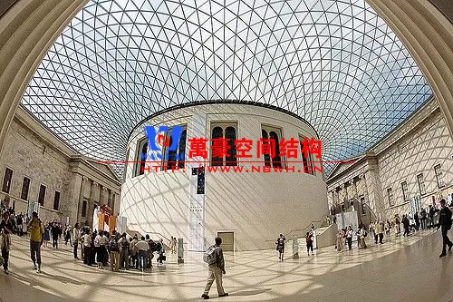 這個(gè)經(jīng)典的改造項(xiàng)目把輕與重巧妙組合。鋼結(jié)構(gòu)網(wǎng)殼內(nèi)側(cè)支承于圓形閱覽室,外側(cè)支承于方形博物館建筑的內(nèi)墻,通過(guò)找形分析得到一個(gè)拱起的規(guī)則形態(tài)。