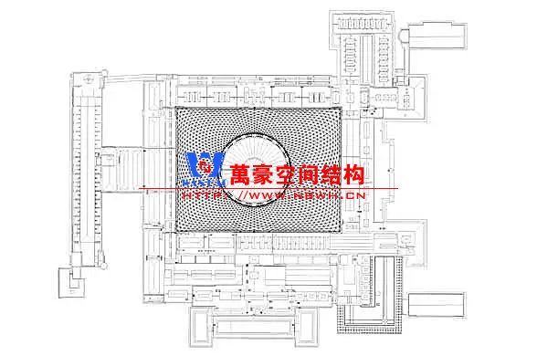 沿中心圓徑向布置主受力網(wǎng)格,再輔助另兩個(gè)方向的圓弧線條劃分出1656個(gè)三角形平面玻璃板。