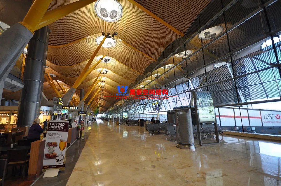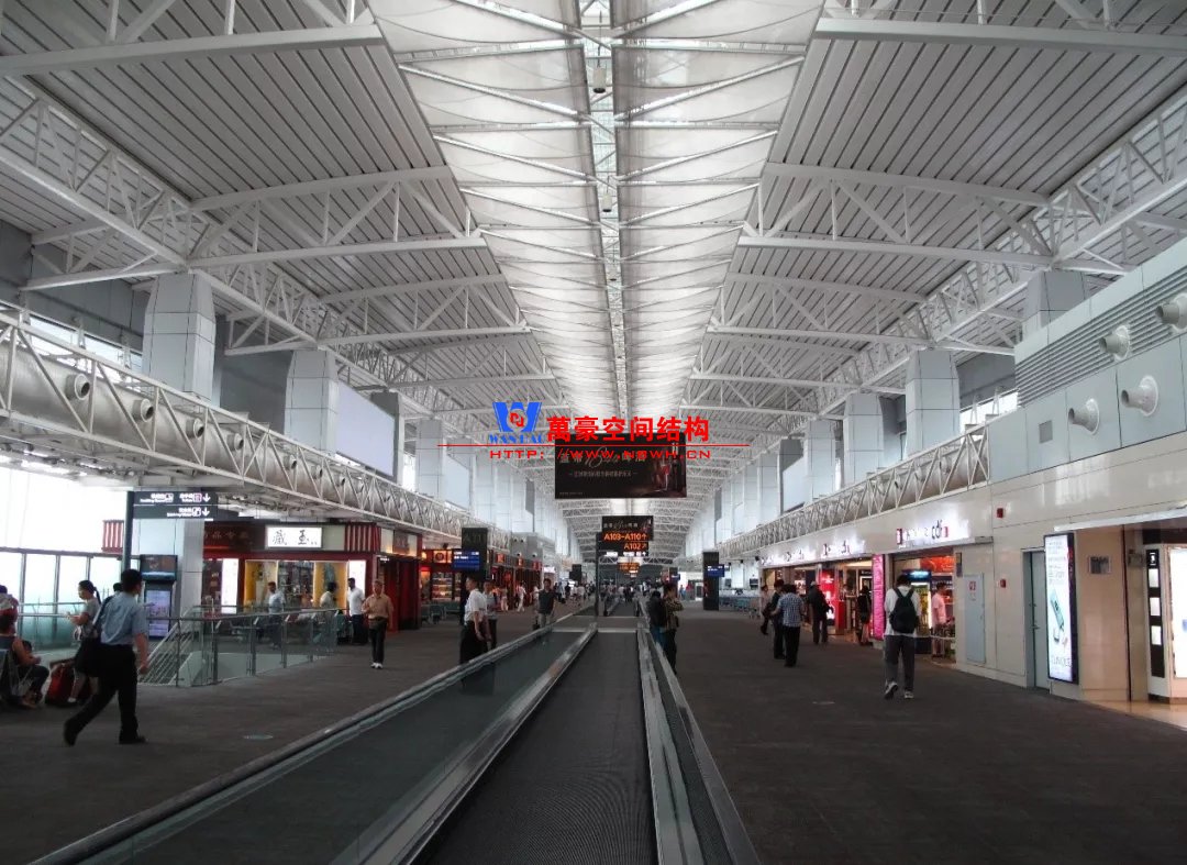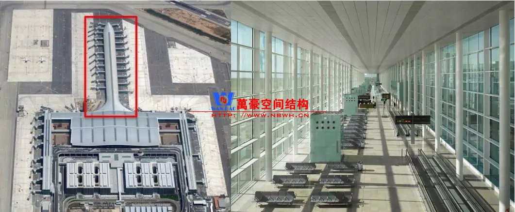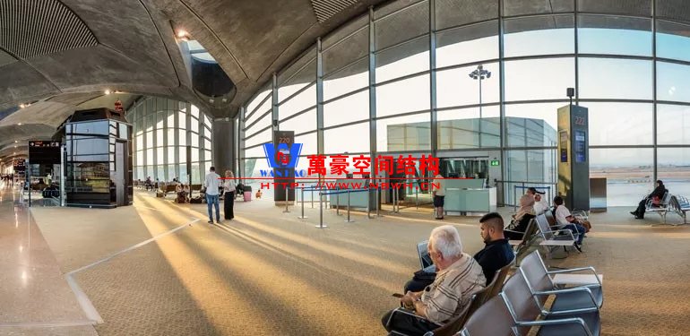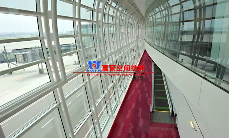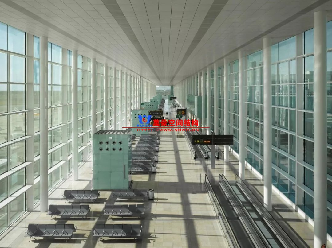 如巴塞羅那機(jī)場(chǎng)的指廊就是采用簡(jiǎn)單的鋼框架結(jié)構(gòu)體系,鋼柱布置于兩邊;幕墻采用剛性幕墻,貼近鋼柱外側(cè)布置;室內(nèi)吊頂無(wú)天窗,吊頂走向沿長(zhǎng)向,空間上有指向性。
