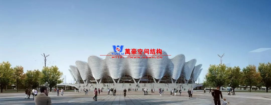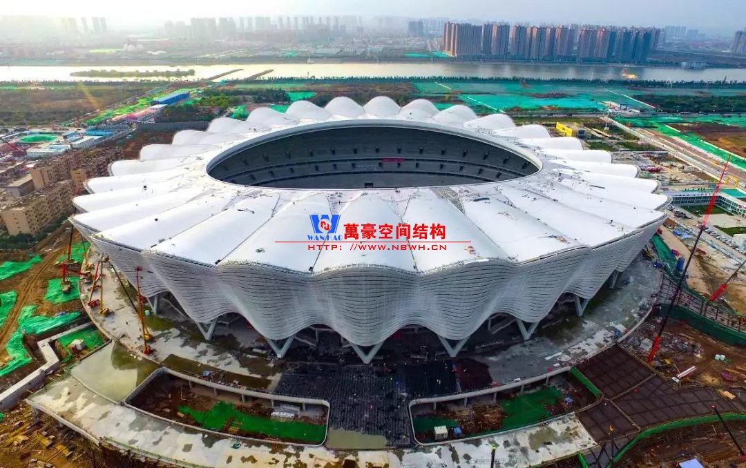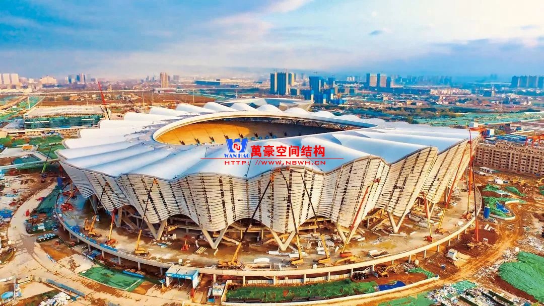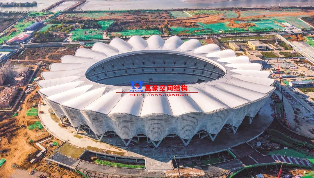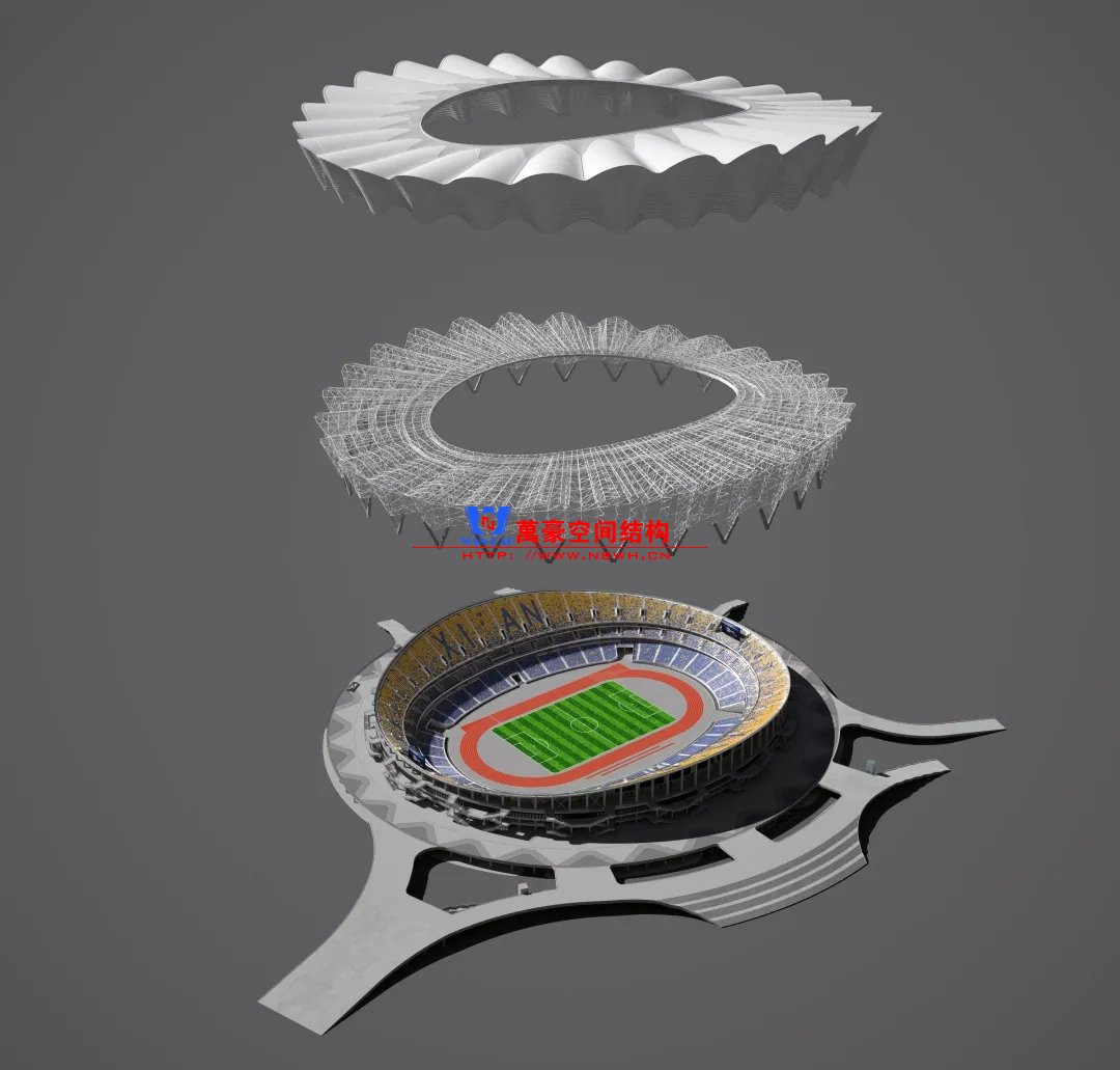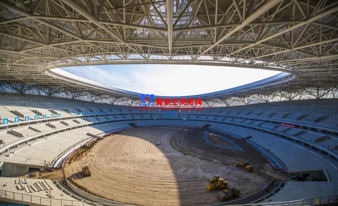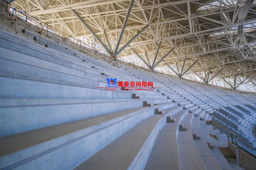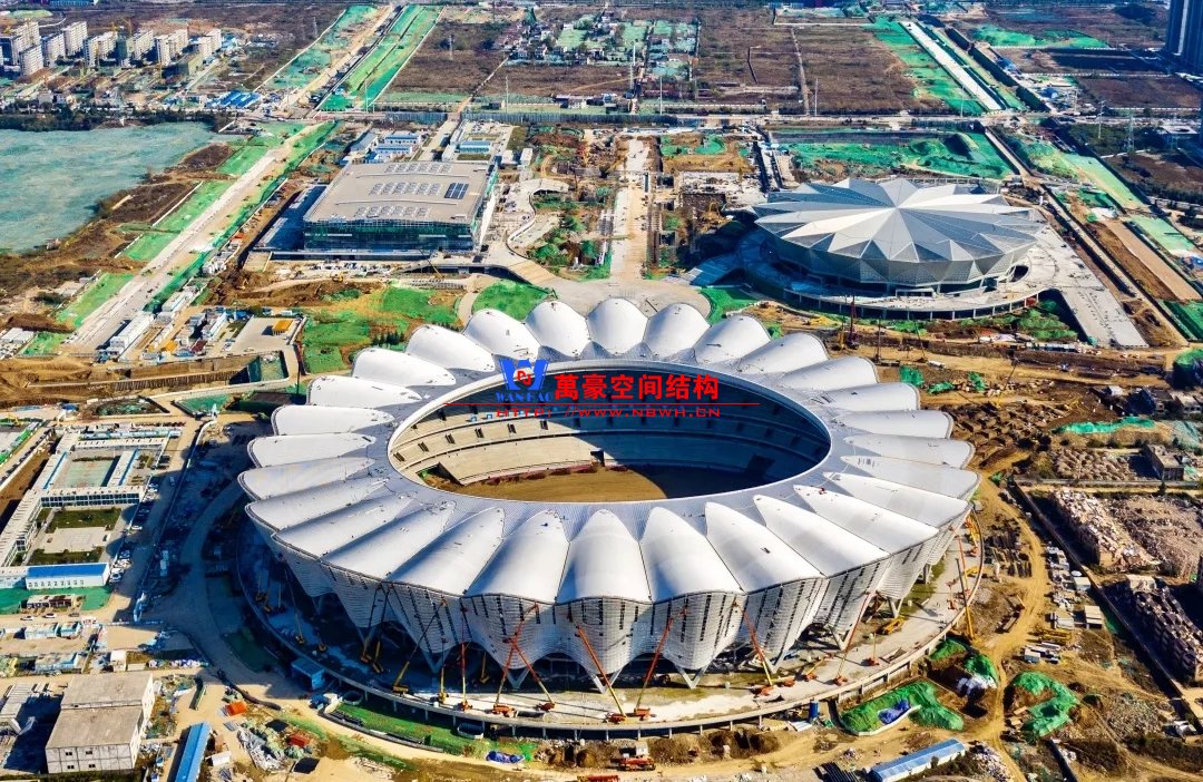 體育場(chǎng)主體建筑為南北長(zhǎng)332m、東西寬316m的橢圓形,鋼結(jié)構(gòu)罩棚最高處高58.3m,最低處高42.6m;中間開口南北長(zhǎng)200m、東西寬153m。主體鋼結(jié)構(gòu)采用空間懸挑鋼桁架結(jié)構(gòu),由28個(gè)V形柱支撐72片鋼結(jié)構(gòu)管桁架,整體東西高,南北低,呈馬鞍形,體育場(chǎng)看臺(tái)為框架-剪力墻體系。屋頂圍護(hù)結(jié)構(gòu)為鋁鎂錳直立鎖邊金屬屋面,罩棚立面采用銀白色穿孔鋁板幕墻系統(tǒng),通過有韻律的變化,表達(dá)了絲綢飄舞的動(dòng)感,輕盈通透的罩棚在夜晚能夠透出賽場(chǎng)內(nèi)熱烈的賽事氣氛,宛如皓月長(zhǎng)空下綻放的盛世之花。碗型看臺(tái)分為上、中、下三層座席,并在中上層看臺(tái)之間設(shè)置包廂層(包括66個(gè)大小包廂)及其座席區(qū),觀眾分別由各層看臺(tái)對(duì)應(yīng)的通道進(jìn)入。