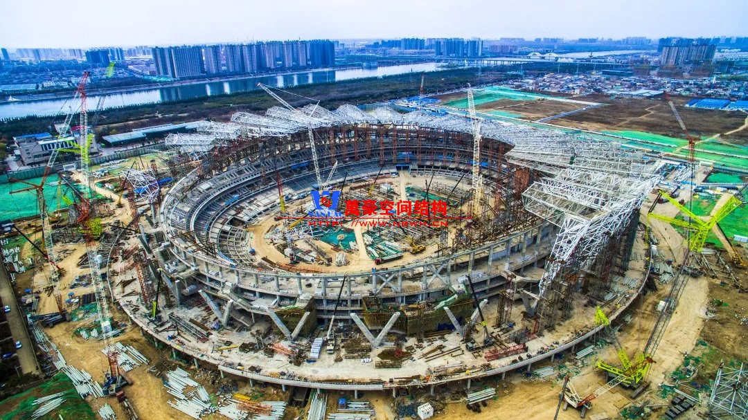 體育場(chǎng)罩棚整體造型呈馬鞍形,采用空間管桁架懸挑結(jié)構(gòu)體系,南北長(zhǎng)332m,東西寬316m,罩棚最高58.3m。2019年1月1日首吊,鋼結(jié)構(gòu)分包中建鋼構(gòu)歷時(shí)87天,消耗近5萬工日、逾5千機(jī)械臺(tái)班,完成168單元、9500噸罩棚鋼桁架吊裝工作,于3月28日提前合攏。