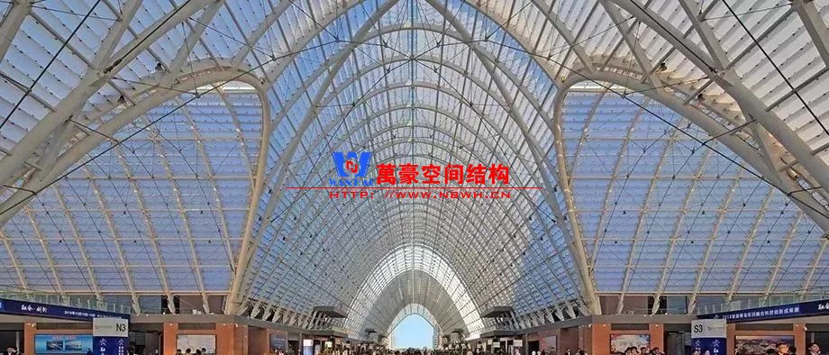建筑內(nèi)在的空間結(jié)構(gòu)形成了外部形態(tài)的美學(xué)韻律和視覺沖擊力,使建筑形象真實而動人。包括展廊與展廳兩部分,以中央十字展廊為功能組織核心,南北各布置6個、共12個獨立展廳單元(尺寸74.4m×136.4m,采用變標(biāo)高的空間桁架鋼結(jié)構(gòu))。展廊平面呈十字型布置,東西向長507m,南北向長287m,主拱和次拱方向分別設(shè)置兩道溫度縫,最高點標(biāo)高為35.0m。