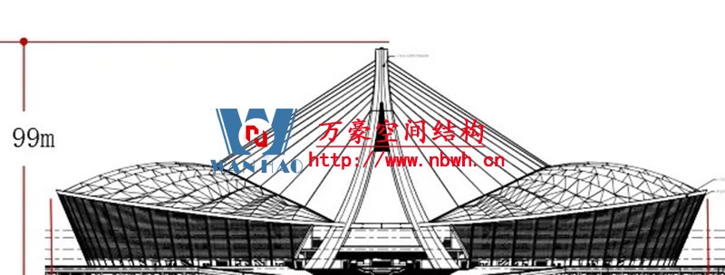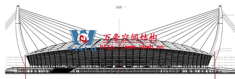 索桁架猶如一把“大傘”自重輕、剛度大,斜拉索與兩座人字形吊塔猶如兩把空中“豎琴”,可實現(xiàn)更大跨度。“大傘+豎琴”的結(jié)構(gòu)組合代表著當今世界空間結(jié)構(gòu)技術(shù)發(fā)展的最高水平,同時也是項目的最大難點所在。