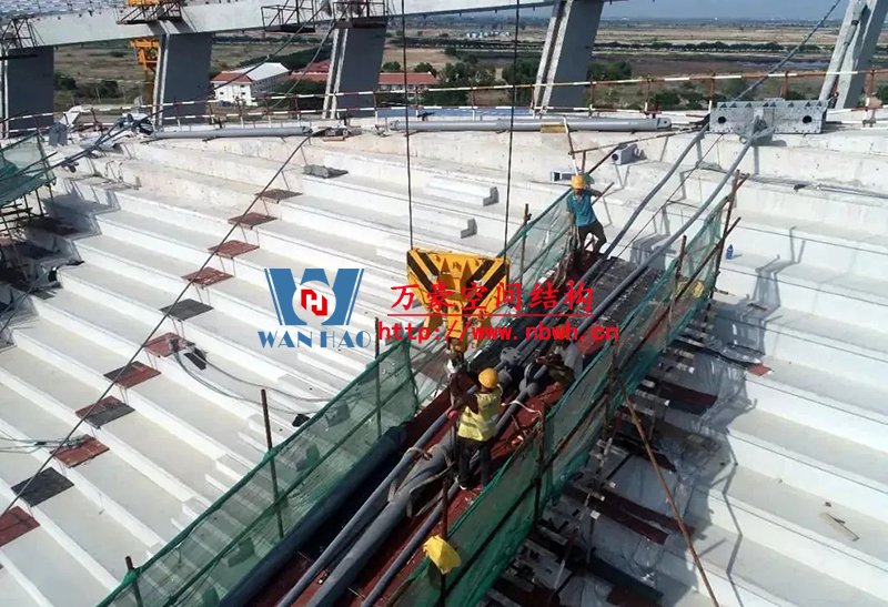 走進援柬埔寨國家體育場,現(xiàn)場張拉施工正在如火如荼的進行,最長達160米的巨型鋼索綿延環(huán)繞在體育場四周,猶如盤踞的巨龍。兩個高達99米的人字形吊塔一端拉起18根斜拉索,另一端連接8根背索,與索桁架共計1100鋼索將看臺罩棚高高擎起。從空中望去,猶如在一把天傘被中部鏤空,再被兩把豎琴輕輕吊起,整體結(jié)構(gòu)氣勢恢宏,美輪美奐。目前,體育場罩棚索網(wǎng)張拉施工已圓滿完成。