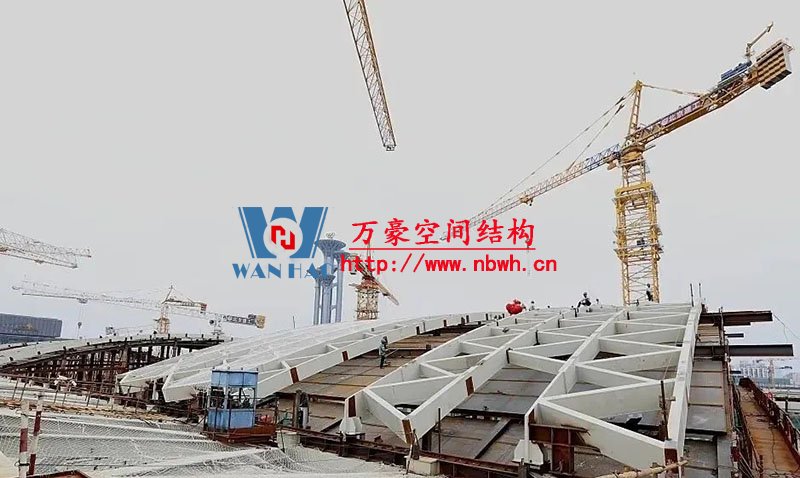 正在滑移施工的鋼屋面網(wǎng)殼用鋼量約2800噸,南北長(zhǎng)168米,東西跨度72米,鋼屋蓋網(wǎng)殼面積大,距離地面高度為44米-52米,高空作業(yè)量大,構(gòu)件吊次多達(dá)3000次,吊裝時(shí)間約2個(gè)月,工期緊,鋼結(jié)構(gòu)焊接精度和質(zhì)量要求極高,屋蓋網(wǎng)殼為索承結(jié)構(gòu),控制變形難度大。
