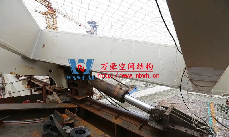 滑移前,事先設(shè)置滑軌,鋼橋兩端各安裝1臺(tái)-2臺(tái)液壓千斤頂和同步傳感器,從2個(gè)平臺(tái)分別向兩側(cè)頂推滑移,每滑移6米要進(jìn)行鋼索張拉,確保屋面結(jié)構(gòu)穩(wěn)固,最終將屋蓋滑移到設(shè)計(jì)位置。