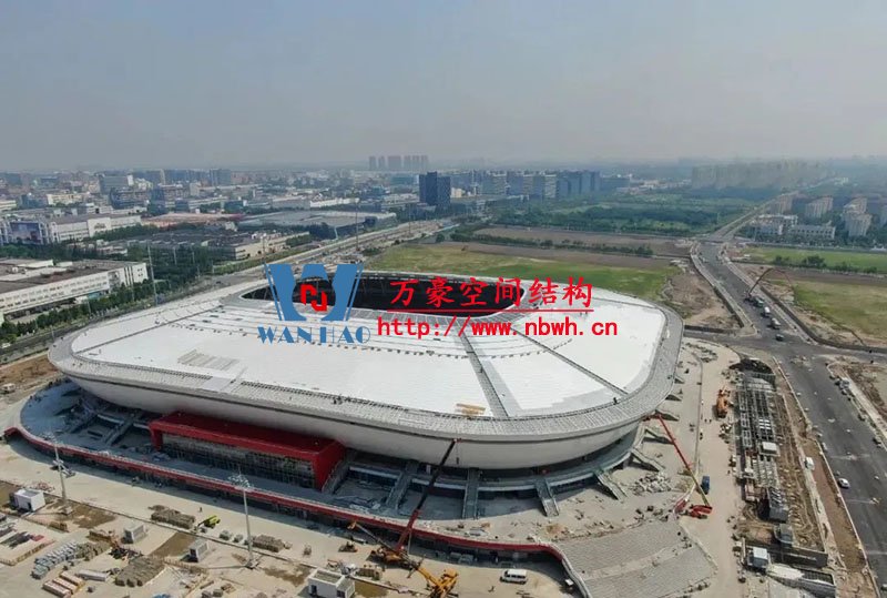 球場的屋蓋采用了預應力輪輻狀張拉體系,就像一個自行車的輪轂橫著蓋在了球場上方,最大特點是用鋼結構和索網結合,取代了以往比較沉重、繁瑣的鋼桁架體系,最大的好處就是輕量化,整個屋蓋的用鋼量在4600噸左右,相比以往傳統(tǒng)的建造方式,在用鋼量上大約減少了50%。