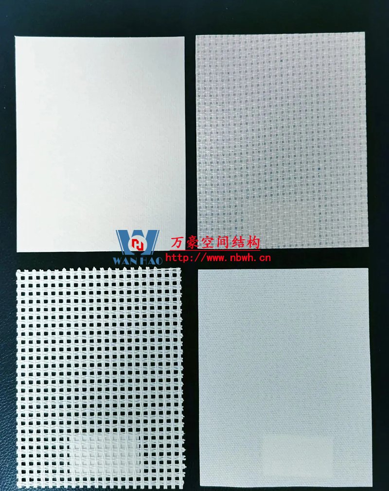 基材紗線編織間距很大,涂層不再是滿覆,形成一定的開(kāi)孔率(20~70%)。特點(diǎn)是透光率高(30~70%,透光透景)、裝飾遮陽(yáng)效果好;強(qiáng)度低于外膜、透氣透水、不吸音。