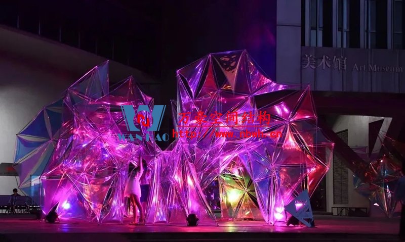 結(jié)構(gòu)體系形成的三角面網(wǎng)格是由計(jì)算機(jī)通過(guò)對(duì)異形曲面細(xì)分并優(yōu)化得到,三角嵌面使用半透明PVC膜。