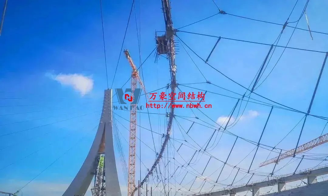 索膜罩棚結(jié)構(gòu)由2.2萬米拉索、219噸索夾節(jié)點(diǎn)、3.3萬平米PTFE膜共同構(gòu)成,如何平衡“天傘”索網(wǎng)結(jié)構(gòu),提升張拉過程中拉索產(chǎn)生的拉力?如何確保索網(wǎng)張拉成形過程中,索桁架體系穩(wěn)定?這是建設(shè)者實(shí)施索網(wǎng)張拉,需要攻克的核心技術(shù)難題。
