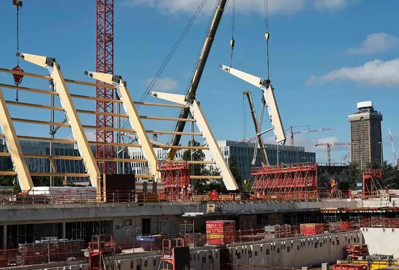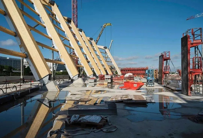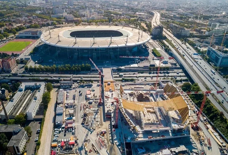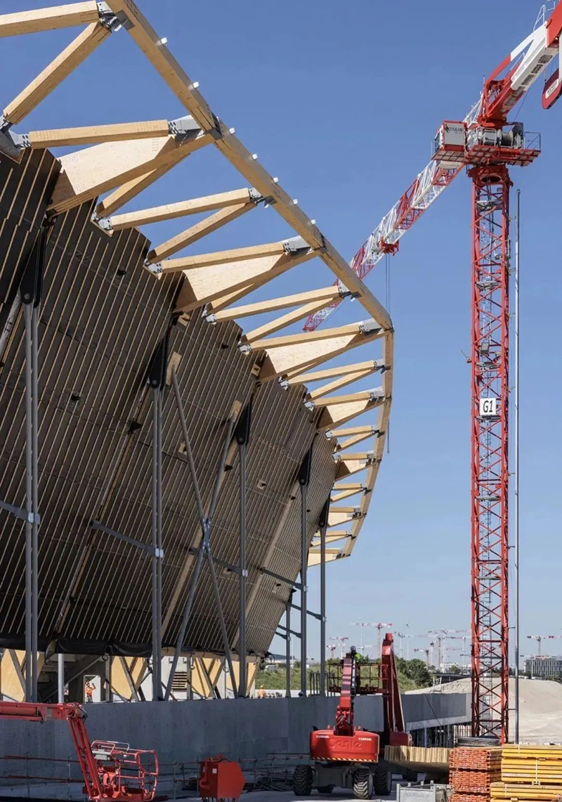 木材是典型的生物基建筑材料之一,是該建筑的主要結(jié)構(gòu)材料。因為木材比其他材料(如混凝土和鋼材)所產(chǎn)生的二氧化碳排放量更少,正好迎合巴黎舉辦歷史上最可持續(xù)的運動會的目標。通過在這個巨大的結(jié)構(gòu)中使用木材,該方案將生物材料的使用比例提高了一倍。