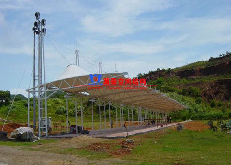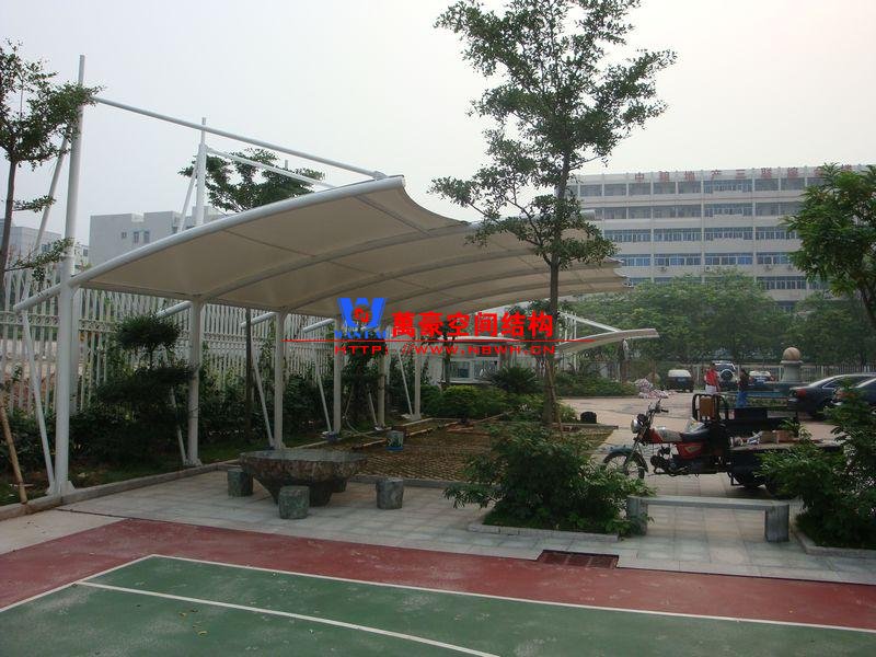膜結(jié)構(gòu)車棚是一種比較新的建筑的形式,生產(chǎn)的材料主要使用的是一些高強(qiáng)的薄膜材料。在進(jìn)行搭建的過(guò)程中主要就是使用鋼架、鋼索等進(jìn)行固定,這樣在空間內(nèi)部就產(chǎn)生了一定的張應(yīng)力。由于使用材料少,內(nèi)部空間大,減少了廢棄物的產(chǎn)生,從另一個(gè)角度來(lái)講,膜結(jié)構(gòu)車棚也是有利于環(huán)保的。