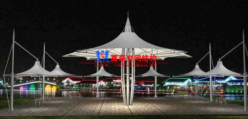 膜結(jié)構(gòu)遮陽(yáng)棚工程頂棚面重量?jī)H為常規(guī)遮陽(yáng)棚的1/30,這就降低了基礎(chǔ)的造價(jià)。同時(shí)膜結(jié)構(gòu)工程奇特的造型和夜景效果有明顯的“建筑可識(shí)性”和商業(yè)效應(yīng),其價(jià)格效益比更高。