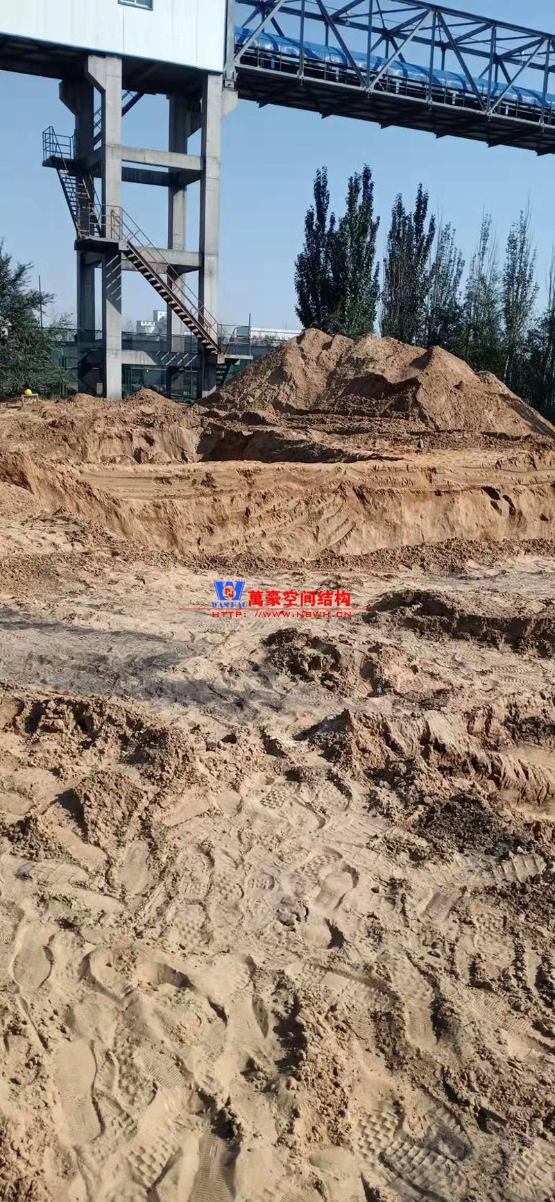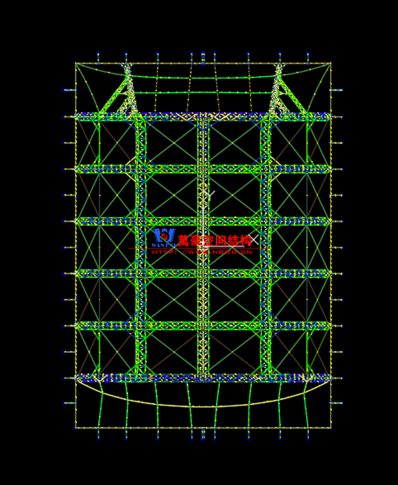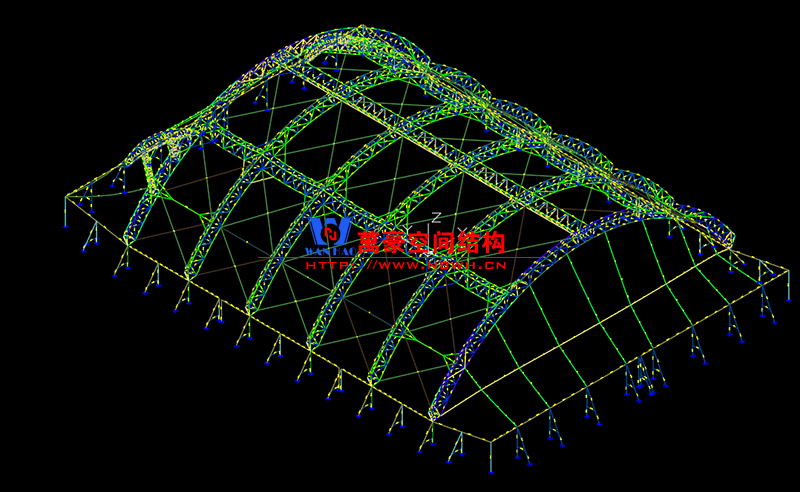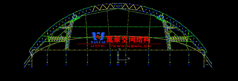 該項目因響應(yīng)國家環(huán)保要求,以煤炭罩棚加蓋。因儲煤場內(nèi)部設(shè)施、設(shè)備特定運(yùn)轉(zhuǎn)需要,對于罩棚的跨度與高度都有特殊要求,跨度、高度通風(fēng)采光。項目的鋼、膜、索全部由我公司設(shè)計、施工與安裝。?