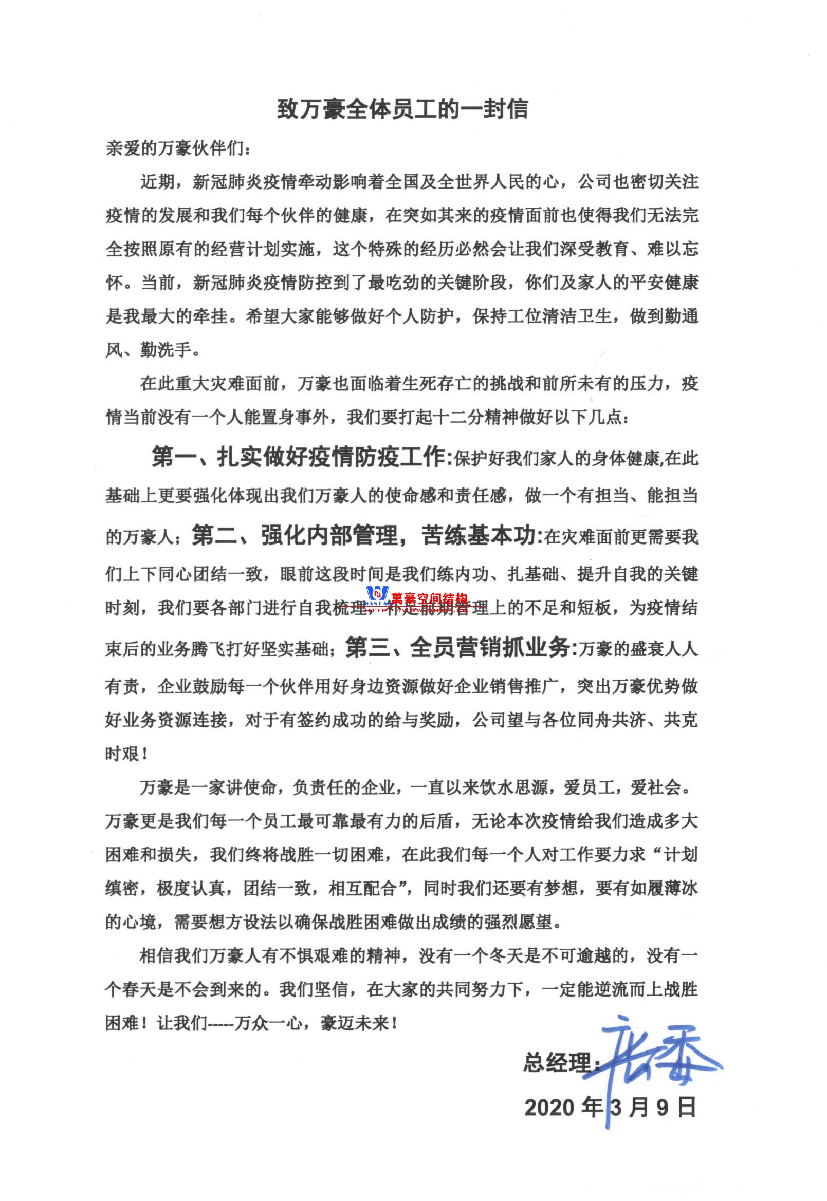 疫情當(dāng)前感謝大家返崗復(fù)工,在此疫情中我們深刻體會(huì)到了前所未有的壓力和困難,目前各行各業(yè)面臨著破產(chǎn)關(guān)門的風(fēng)險(xiǎn),我們同樣面臨著各方面的挑戰(zhàn)。在此存亡之際挑戰(zhàn)面前更需要我們上下同心,團(tuán)結(jié)一致共同面對(duì)目前的困難;萬(wàn)豪是有使命感和責(zé)任感的企業(yè),在此危難時(shí)刻更能體現(xiàn)我們每個(gè)人的擔(dān)當(dāng)和格局,特此給萬(wàn)豪全體員工書信一封,望大家能仔細(xì)查閱并落到實(shí)處,公司倡導(dǎo)全員營(yíng)銷,非市場(chǎng)部門員工如相互有業(yè)務(wù)連接、推薦、介紹給公司,統(tǒng)一報(bào)備總經(jīng)辦蔡總處登記備案,簽約成功公司將給與獎(jiǎng)勵(lì)。