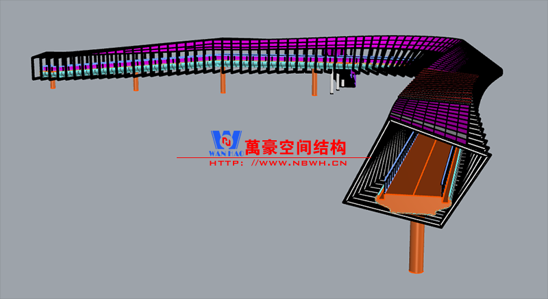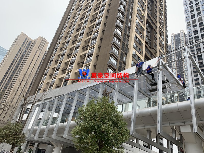 深圳龍崗三館一城項目市政配套工程1號連廊膜結構工程項目為單層ETFE膜結構,共劃分為101個單元,總面積約為2000㎡,由寧波萬豪空間結構工程有限公司承建。膜結構原材采用德國NOWOFOL-300μm鍍點ETFE材料,保證透光率的同時,兼顧防范紫外線。膜結構四周利用鋁合金夾具固定于主鋼結構二次構件上,膜面采用PE鋼索輔助支撐,確保膜面有效承擔相應動荷載。