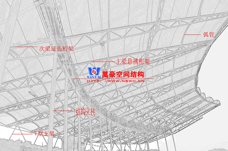 主桁架之間用弧管連接,弧管起著調(diào)整各主桁架間的內(nèi)力分配,同時(shí)作為主桁架的側(cè)向支撐,傳遞側(cè)向水平荷載、提高整體結(jié)構(gòu)的穩(wěn)定性。弧管呈矢高1m~1.5m的拱形,能更好的支撐膜面,使之更具備自排雨、雪的功能。