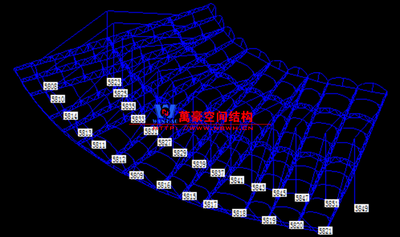 該工程膜結(jié)構(gòu)及相應(yīng)的支承結(jié)構(gòu),均是以內(nèi)部主體結(jié)構(gòu)為承載體,通過膜體及相關(guān)的結(jié)構(gòu)支承。選用3S3D11.0設(shè)計(jì)軟件進(jìn)行分析,計(jì)算簡(jiǎn)圖見圖II-19-8??紤]恒荷載0.01KN/ m2,風(fēng)荷載0.55KN/m2 ,雪荷載0.35KN/m2 ,活荷載0.3KN/m2。