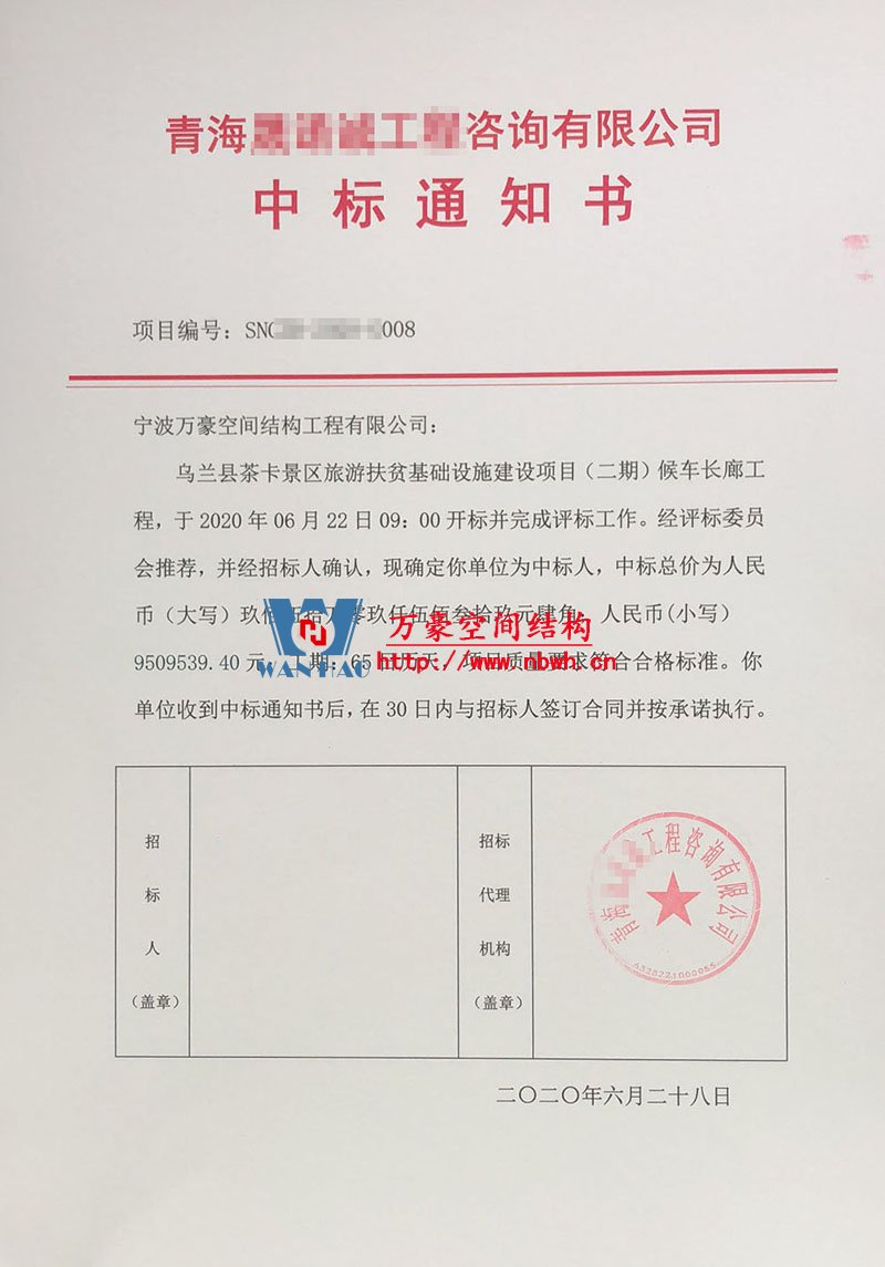 喜訊?。?! 祝賀我司中標烏蘭縣茶卡景區(qū)旅游扶貧基礎設施項目(二期)膜結(jié)構(gòu)工程。 該項目位于青海省海西蒙古族藏族自治州烏蘭縣茶卡景區(qū),工程用鋼量200噸,膜結(jié)構(gòu)展開面積6000平米,建成后將成為當?shù)亓硪坏貥诵越ㄖ?/span> 這是萬豪2020年的第8標,萬豪定當再接再厲,完美完成此次工程,大家拭目以待。