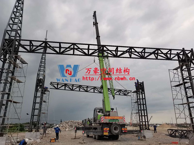 紹興西高速收費站頂棚工程用鋼量80噸,由寧波萬豪空間結(jié)構(gòu)工程有限公司加工和安裝。
