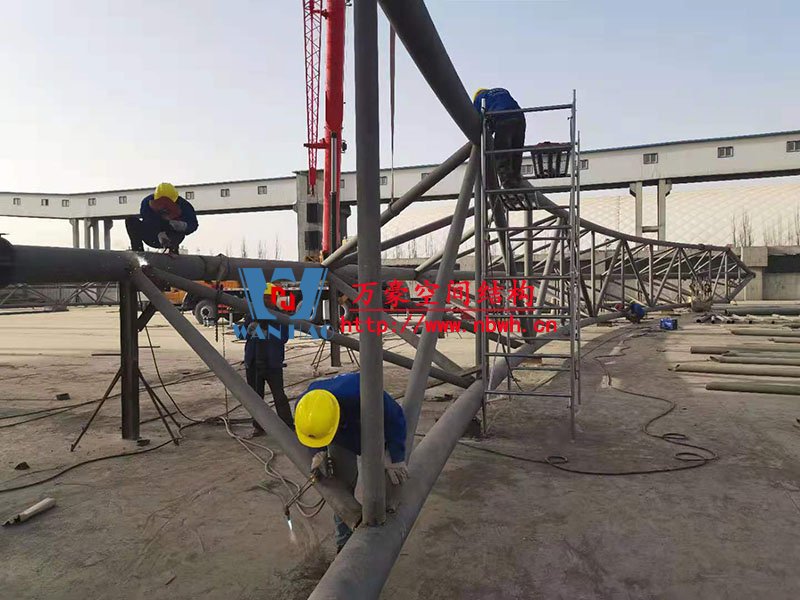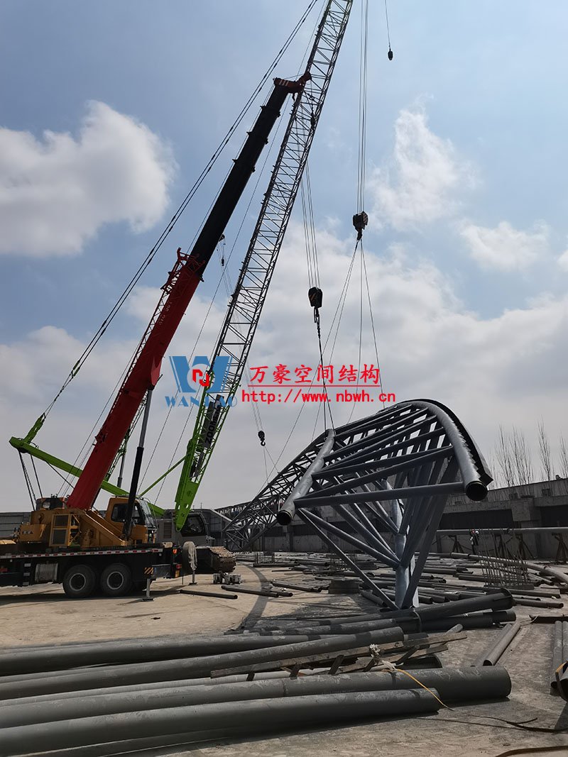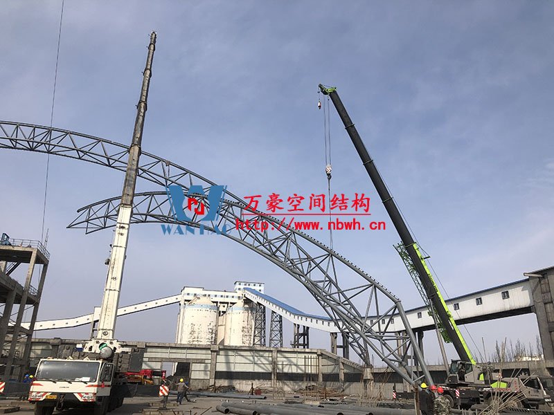 內(nèi)蒙能源長城五礦選煤廠鋼骨架膜棚建設(shè)項目位于內(nèi)蒙古鄂托克前旗上海廟鎮(zhèn)長城五礦選煤廠內(nèi)。 本項目膜結(jié)構(gòu)罩棚鋼結(jié)構(gòu)高度40米,跨度115米,膜結(jié)構(gòu)展開面積25000平米。 鋼結(jié)構(gòu)主桁架一共6跨,目前已完成2跨。