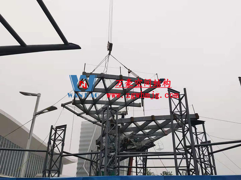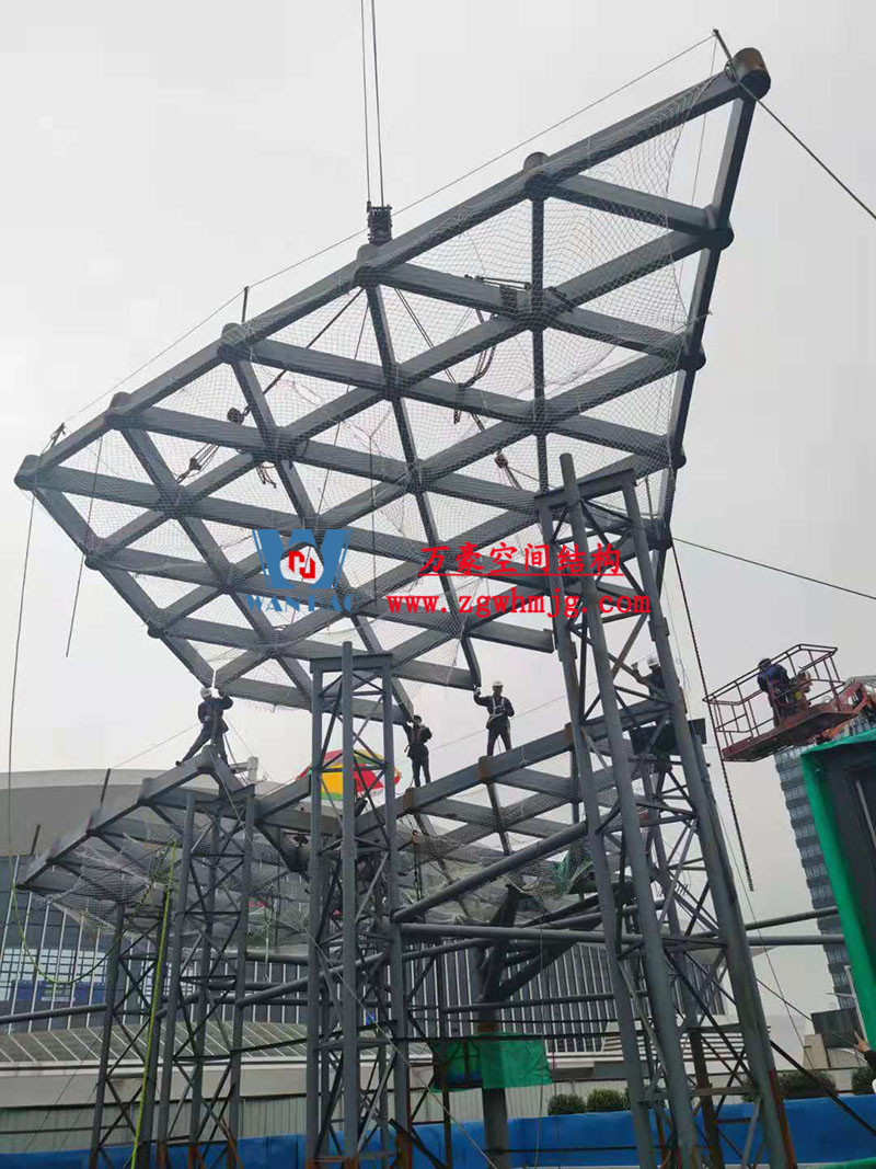 本工程鋼結(jié)構(gòu)為單層雙曲網(wǎng)殼結(jié)構(gòu)體系,平面上為對稱結(jié)構(gòu),大翅膀長跨約 50m,短跨約 25m,小翅膀長跨約 35m,短跨方向約 15m。建筑頂面為雙曲造型,建筑物最高點標高約17米??傆娩摿?00噸,膜體總面積約7000平方米。