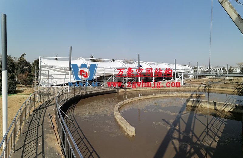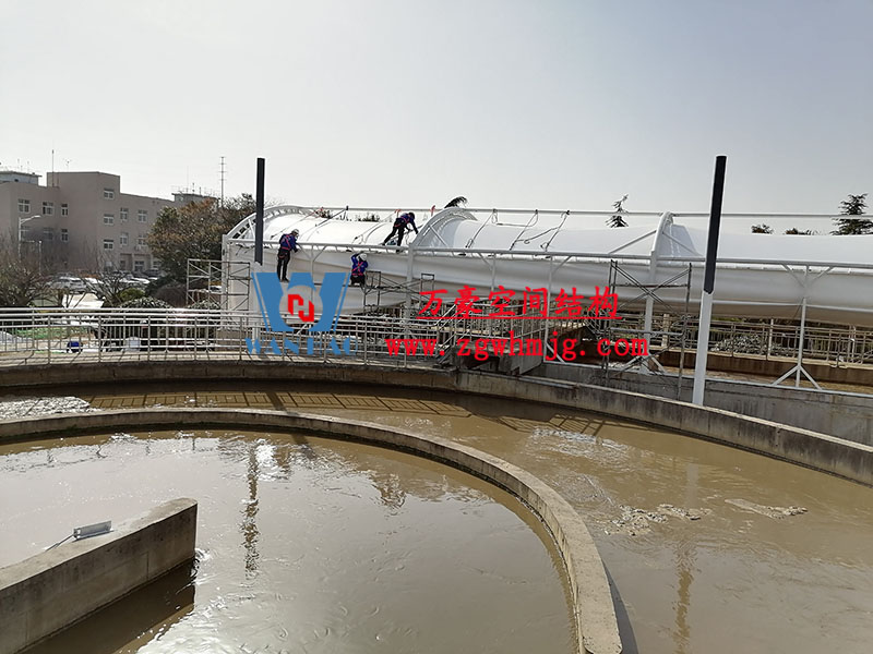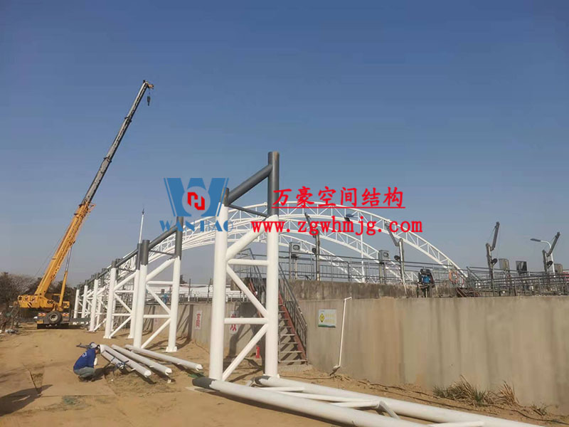 目前,進水口、粗格柵、細格柵、厭氧池兩個池子鋼結構都已完成 ,厭氧池立面膜已張拉,開始裝側面膜,南區(qū)氧化溝三個主桁架完成 ,準備進行下一步施工。