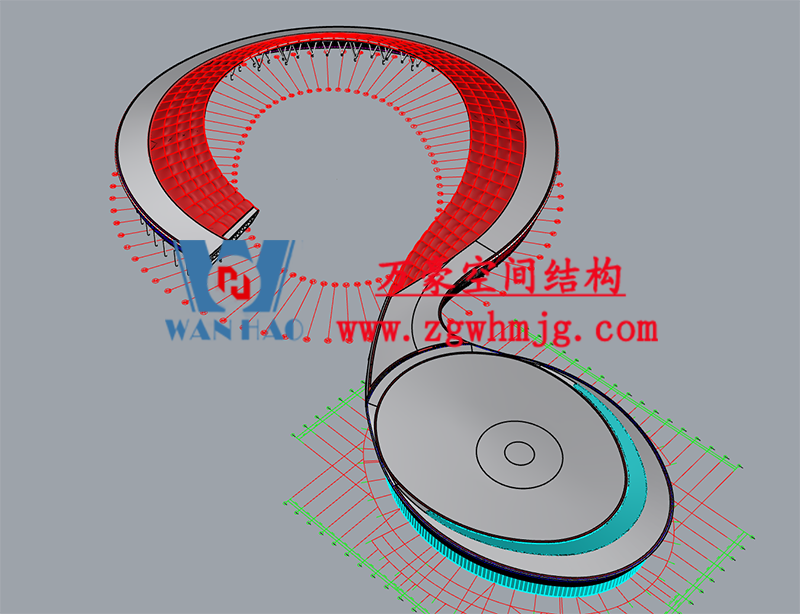 項(xiàng)目共有256跨懸挑,其中最大懸挑32m,最小懸挑4m。中間由向上托拱聯(lián)接而成,后面與鋁板交接,是常規(guī)類大型體育場(chǎng)館。