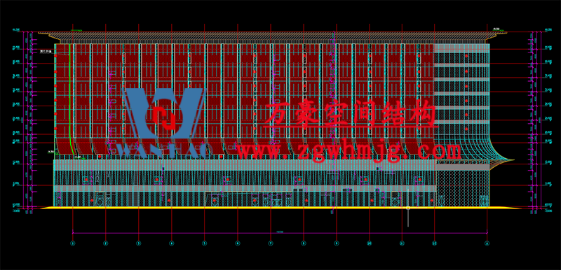 該項(xiàng)目屋面材料選用高自潔PTFE膜材,膜結(jié)構(gòu)展開面積合計(jì)20000平米。項(xiàng)目共有256跨懸挑,其中最大懸挑32m,最小懸挑4m。中間由向上托拱聯(lián)接而成,后面與鋁板交接,是常規(guī)類大型體育場(chǎng)館。