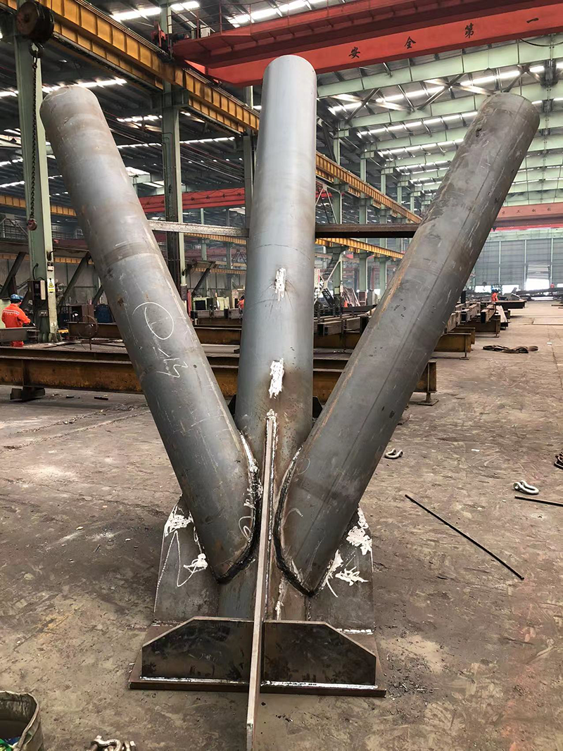 該項目柱腳節(jié)點復雜,為避免應力集中,確保結構安全,柱腳三根桿件在工廠組焊成整體進行吊裝,然后和現(xiàn)場拼接桿件對接。