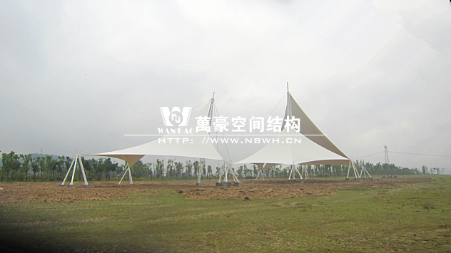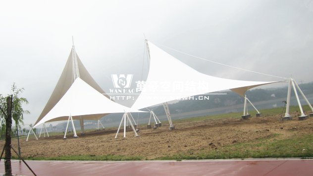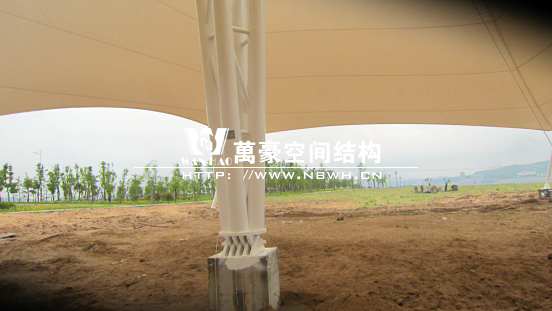 本景觀膜結(jié)構(gòu)安全等級為二級,膜材選用意大利進口雙面PVDF超自潔涂層膜材,鋼結(jié)構(gòu)設(shè)計使用年限25年。張拉膜近2千㎡、高度26.88米,總用鋼量約為57.69噸。桁架、鋼管材質(zhì)均為Q345B鋼,相貫焊接。所有鋼構(gòu)件熱鍍鋅處理,運輸、安裝過程中對涂層的損傷,須視損傷程度的不同釆取相應(yīng)的修補方式,對拼裝焊接的部位必須清除焊渣,進行表面處理達到St3級要求后,涂刷環(huán)氧無機富鋅底漆+環(huán)氧云鐵中間漆+氟碳面漆。