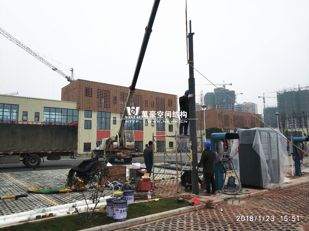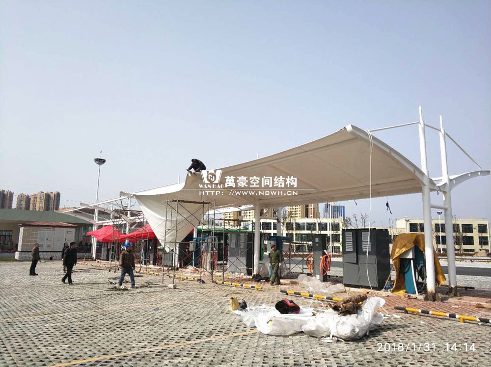 而本工程位于岳池火車站的對面的客運中心,是比亞迪公交車充電樁的附屬設施。工程總用鋼量達8噸,膜材面積400平方米,以雙挑的形式為現(xiàn)場的充電樁遮陽擋雨。